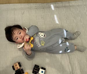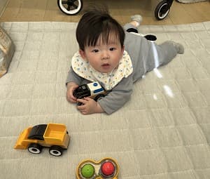 寝返りをしたり、おもちゃを掴んで眺めたり、かわいい笑顔も見せてくれました♡