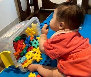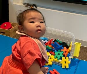 保育スタッフのお膝や自分で上手にお座りし、ブロックやチェーンが気に入り、音をならして遊んでいました♪